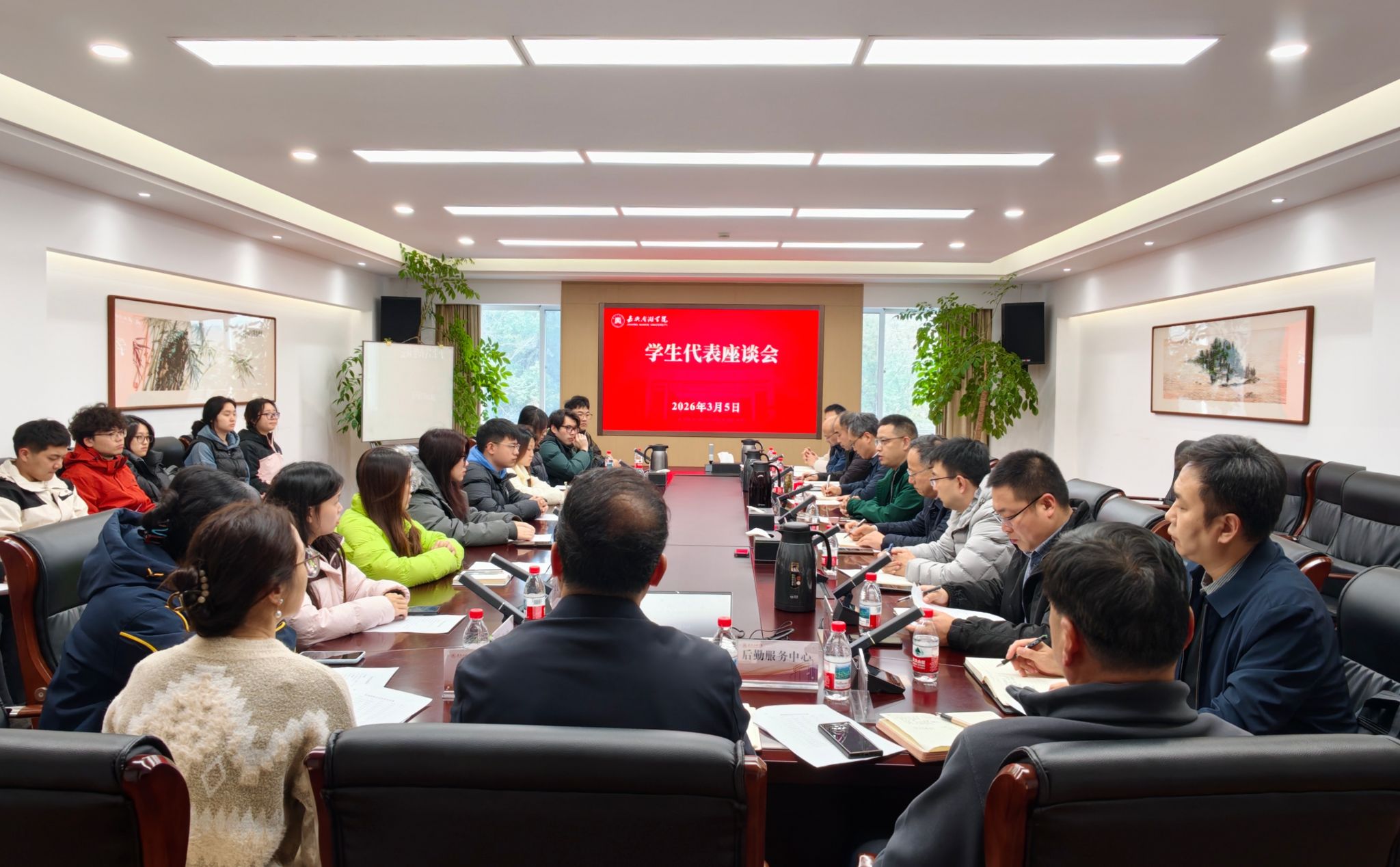 党(校)办、宣传部、教务处、学生处、校建处、安保部、体军部、团委、图书馆、后勤服务中心等部门相关负责人参加座谈会。